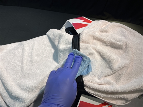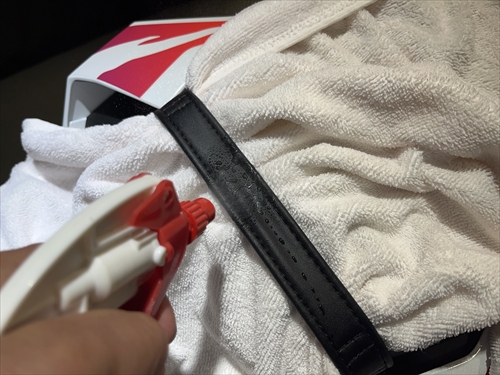 不純物の付着もありますので、まずはレザー専用の特殊溶剤を使って不純物を除去クリーニングしていきます。