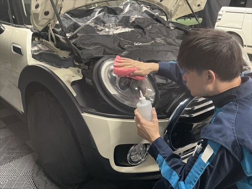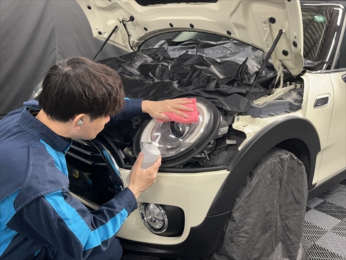 本来であれば、ここから再度ヘッドライト磨き(研磨)を行いたいところですが、お客様とご相談した結果、このままの状態でカープロテクションフィルムを施工することになりました。