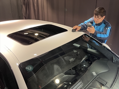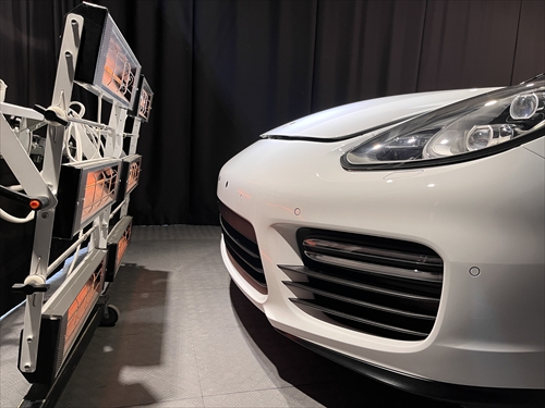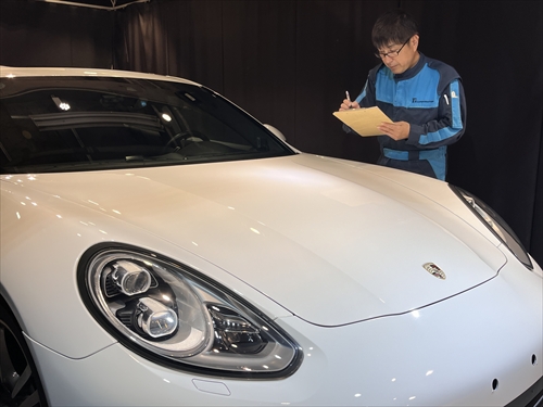 特殊照明を配置したコーティングブース内において、塗装膜厚計や光沢計等の計器類を用いながらボディチェックをしていきます。