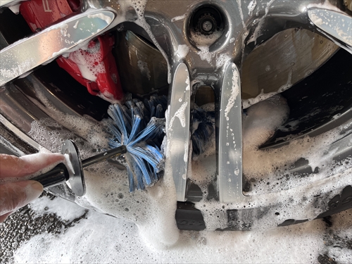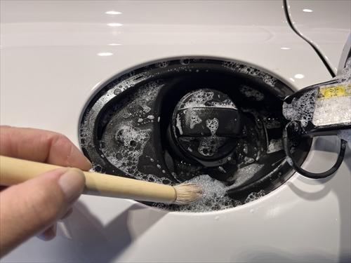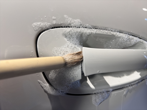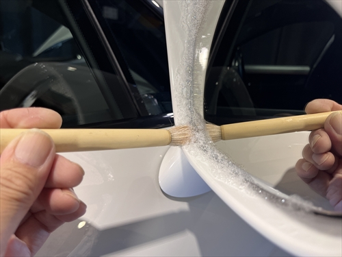 この他にもパーツの継ぎ目や給油口の中、エンブレム周りやグリル、ナンバープレートの裏側等々、細部に至るまで特殊溶剤や熊野筆等を使ってクリーニングしていきます。