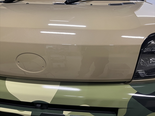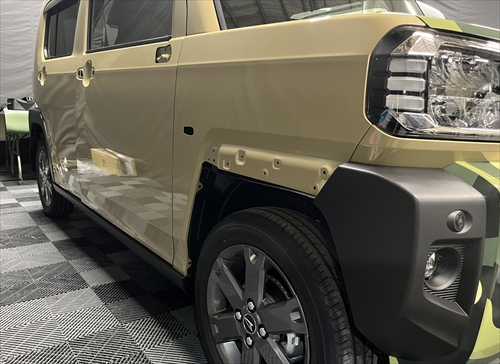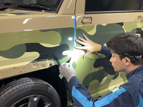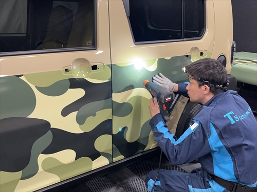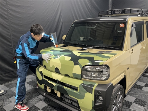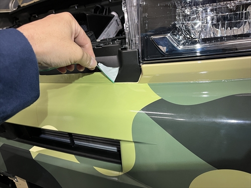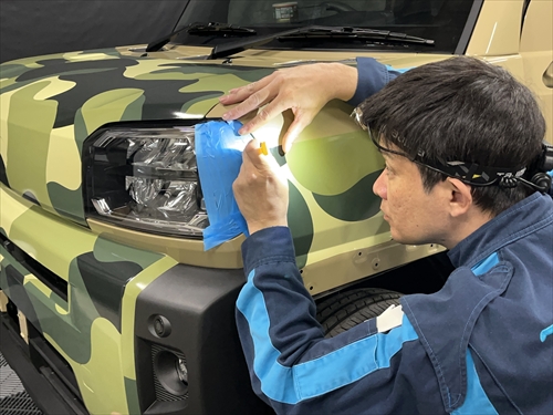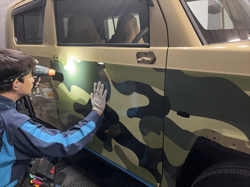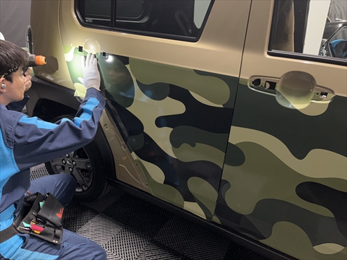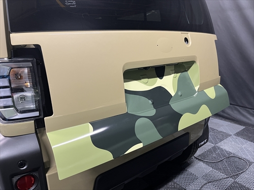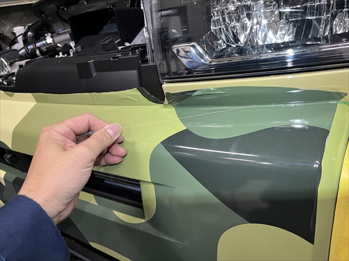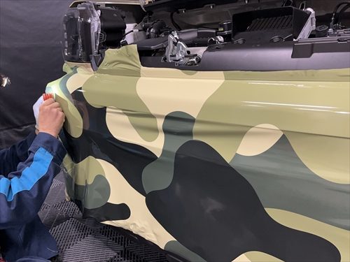 お客様とご相談させていただいた結果、ボディ色を生かしつつ、グリーンの迷彩柄のフィルムでハーフラッピングすることになりました。