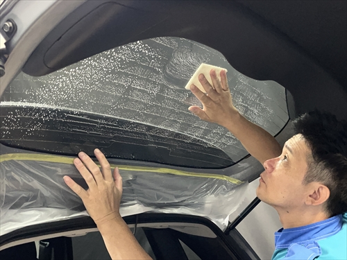 プライバシーガラスになっている後部ガラスには「断熱スモーク」をそれぞれ施工していきます。