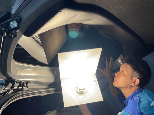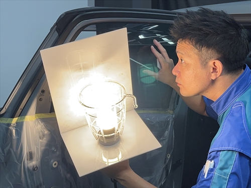 フィルム施工後は専用ライトを使ってチェックを行います。