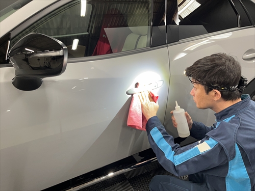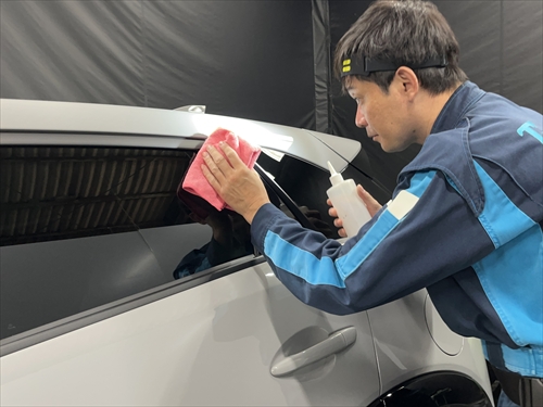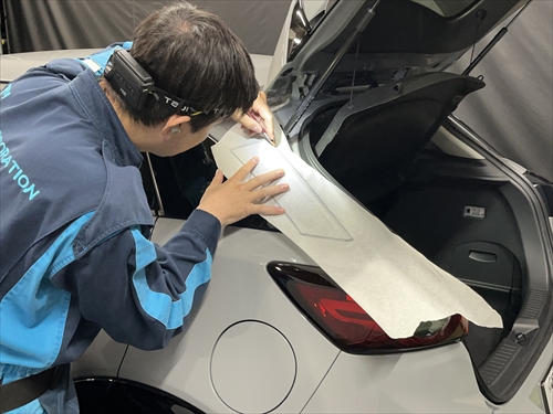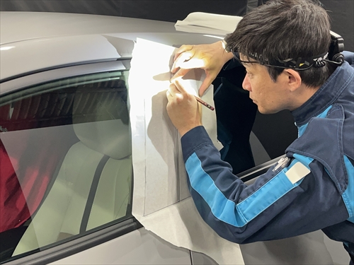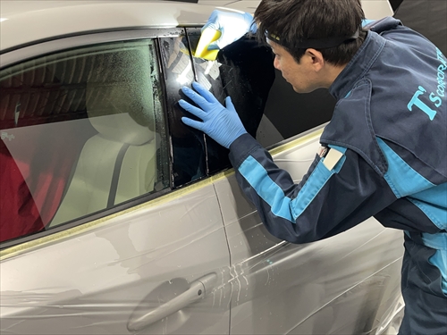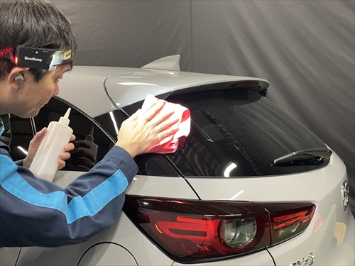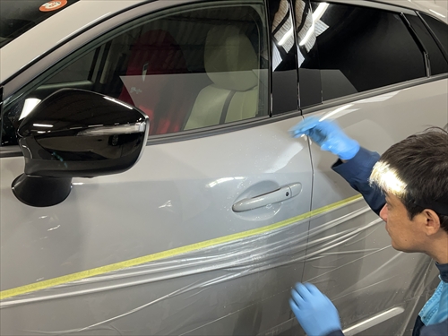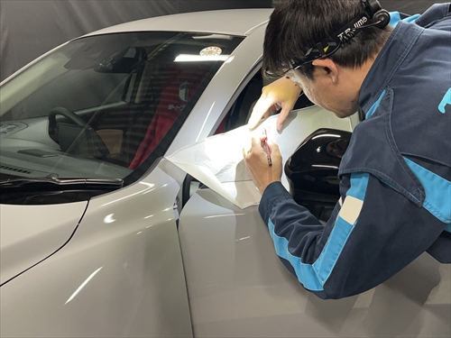 特殊溶剤を使って不純物を除去クリーニングしたら、カープロテクションフィルムを貼っていきます。