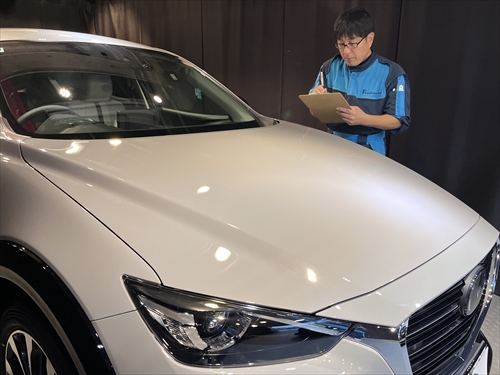 特殊照明を配置したコーティングブース内において、塗装膜厚計や光沢計等の計器類を用いながらボディチェックをしていきます。