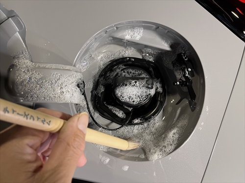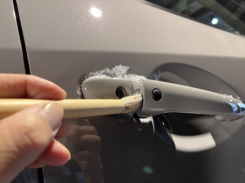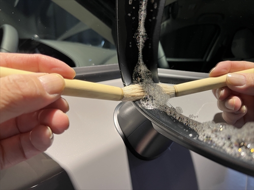 この他にもパーツの継ぎ目やモールの溝、エンブレム周りやグリル部分、給油口の中やナンバープレートの裏側まで、特殊溶剤と熊野筆等を使って細部に至るまでクリーニングしていきます。