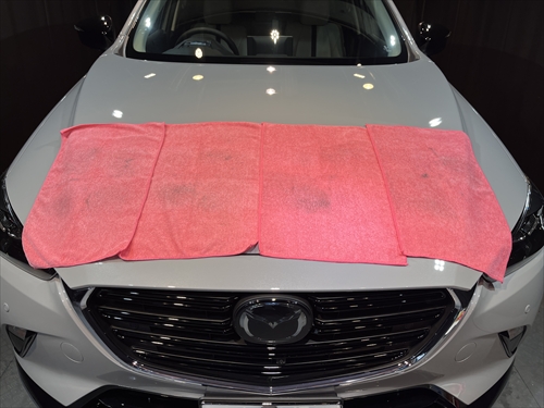 新車で尚且つ洗車をした後にも関わらず、特殊溶剤に反応してこのように不純物が浮き上がってきましたので・・・