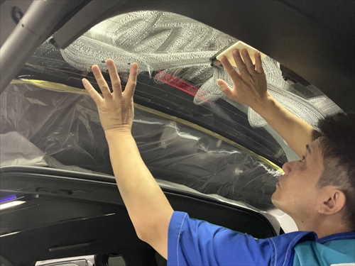 内張りの取り外しや養生等の準備を終えたら、早速フィルム施工に取り掛かります。