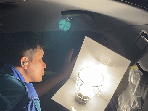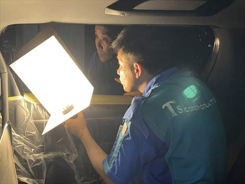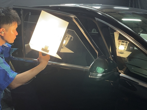 フィルム施工後は専用ライトを使ってチェックを行います。