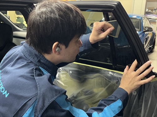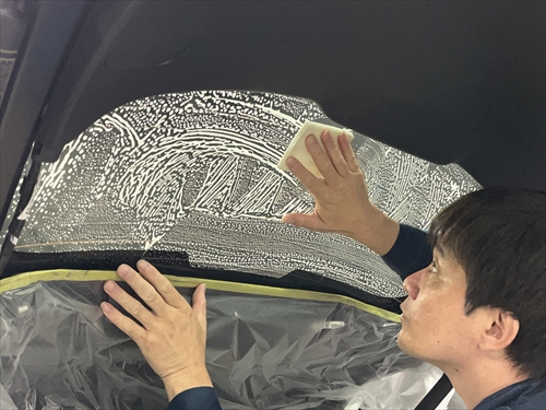 養生や内張りの取り外し等の準備をしたら、リアガラスから施工していきます。
