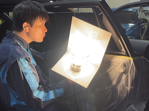 フィルム施工後は専用ライトを使ってチェックを行います。