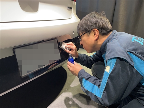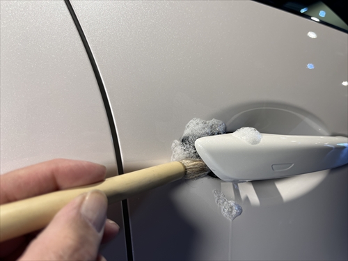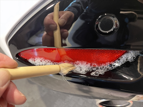 この他にもパーツの継ぎ目やモールの溝、エンブレム周りやグリル部分、給油口の中やナンバープレートの裏側まで、特殊溶剤と熊野筆等を使って細部に至るまでクリーニングしていきます。