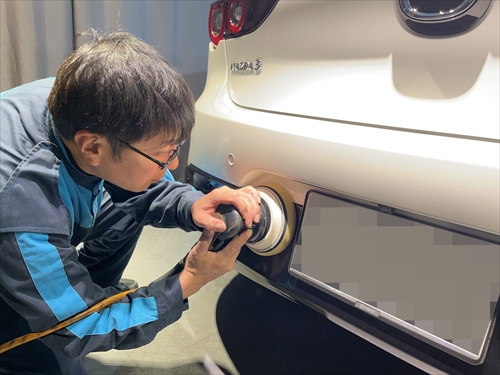交換したリアバンパーを磨いていきます。