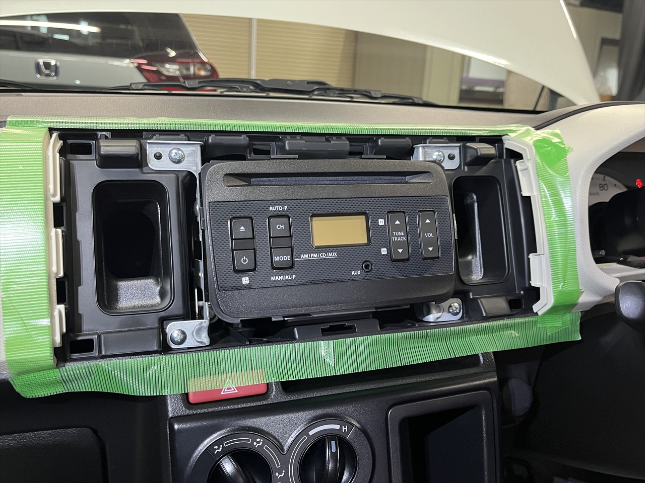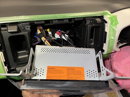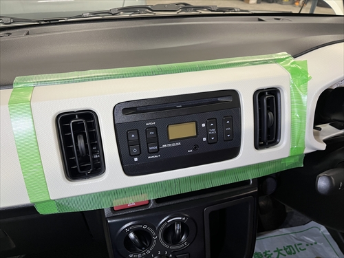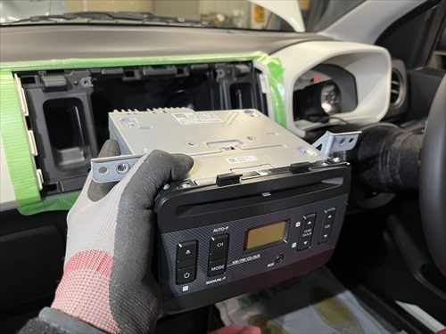 傷を付けないようにキッチリ養生をしたら、純正オーディオを取り外していきます。