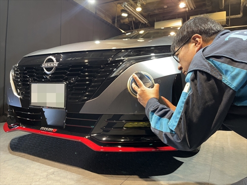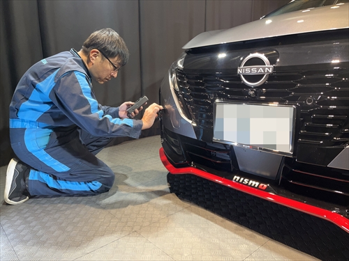 駐車場に停めていた際にフロントバンパーを引っ掛けられたらしく、車屋さんにお身内がおられることから修理はそちらで行われました。