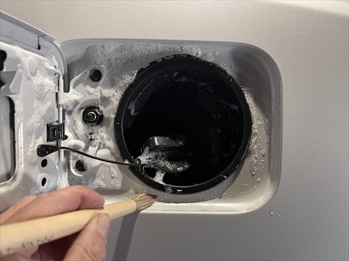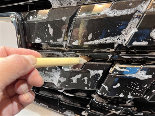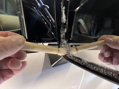 この他にもモールの溝やパーツの継ぎ目、エンブレム周りや給油口の中、グリルやナンバープレートの裏側等々、普通のお手入れでは手の届かない細部に至るまで特殊溶剤や熊野筆等を使ってクリーニングしていきます。