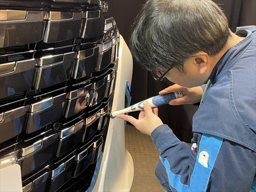 特殊照明を配置したコーティングブース内において、塗装膜厚計や光沢計等の計器類を用いながらボディチェックをしていきます。