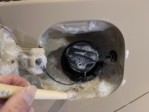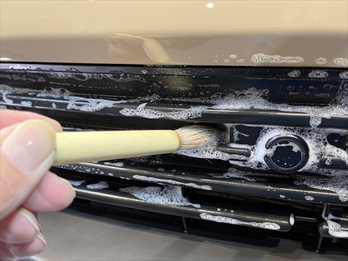 この他にもモールの溝やパーツの継ぎ目、エンブレム周りや給油口の中、グリルやナンバープレートの裏側等々、普通のお手入れでは手の届かない細部に至るまで特殊溶剤や熊野筆等を使ってクリーニングしていきます。