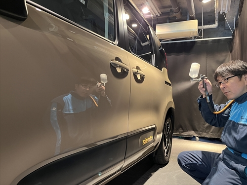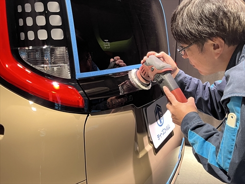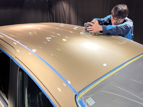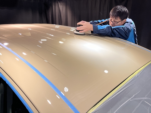 ボディ全体を磨いた後、特殊なベースコンパウンドを使用した研磨処理によって薄い被膜を形成する塗装強化処理を行っていきます。