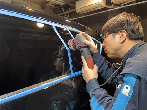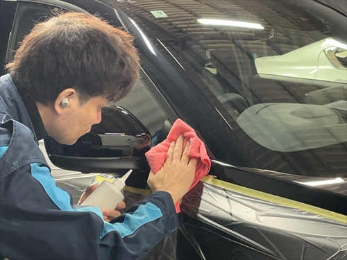 特殊溶剤を使って不純物を分解除去クリーニングしたら、PPF(ペイントプロテクションフィルム)を貼っていきます。