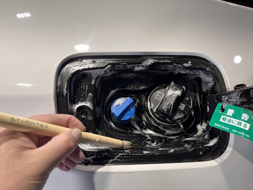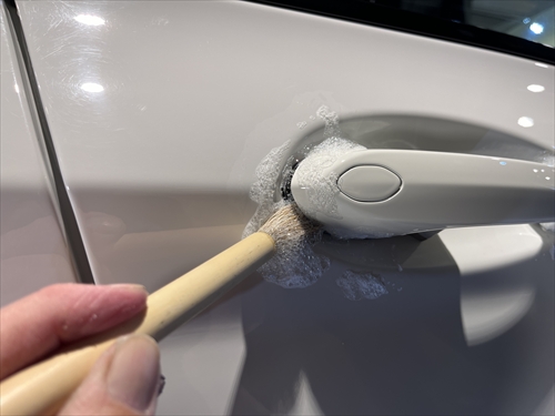 この他にもパーツの継ぎ目やモールの溝、エンブレム周りやグリル部分、給油口の中やナンバープレートの裏側まで、特殊溶剤と熊野筆等を使って細部に至るまでクリーニングしていきます。