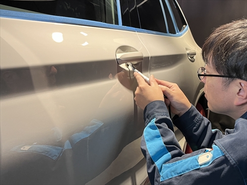特殊照明を配置したコーティングブース内において、塗装膜厚計や光沢計等の計器類を用いながらボディチェックをしていきます。