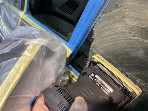 特殊溶剤とサンダーやポリッシャー等の研磨機材を使用してガラスを磨いていきます。