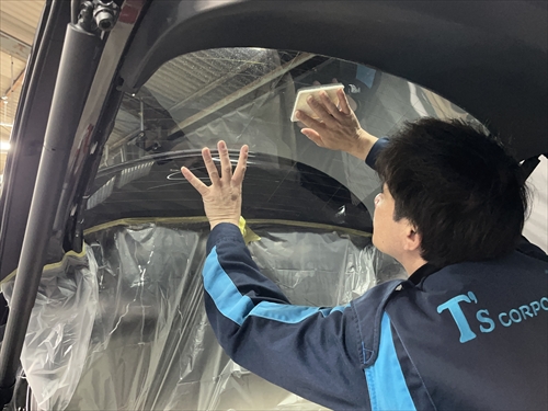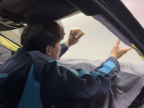 フロントガラス・フロントドアガラス・ベンチガラスに「透明断熱フィルムIRヒートカット」を施工していきます。