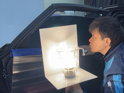 フィルム施工後は専用ライトを使ってチェックを行います。