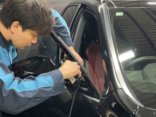 内張りの取り外しや養生等の準備を終えたら、早速フィルム施工に取り掛かります。