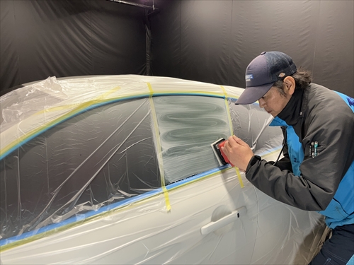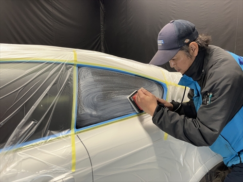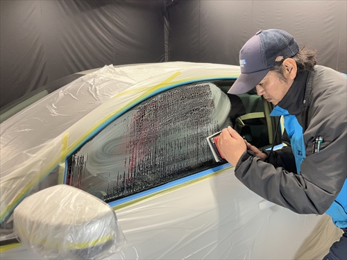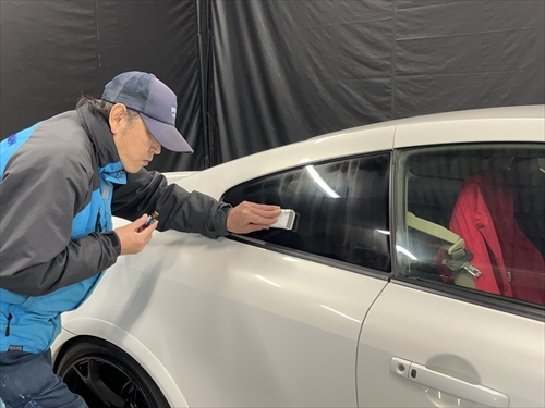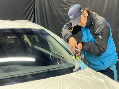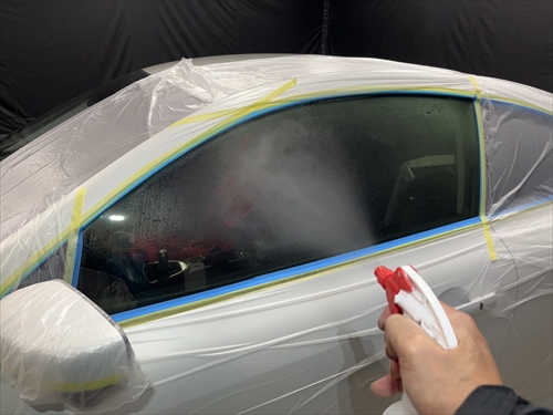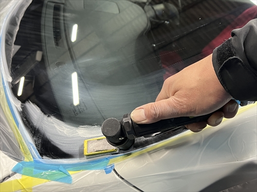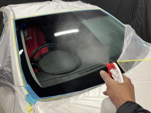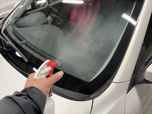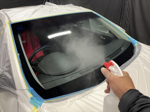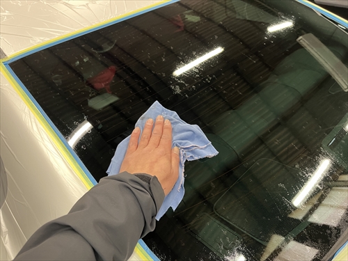 ガラス撥水コーティングに取り掛かりますが、お客様とご相談させていただいた結果、交換したリアガラスだけでなく、全面ガラスの施工をすることになりました。