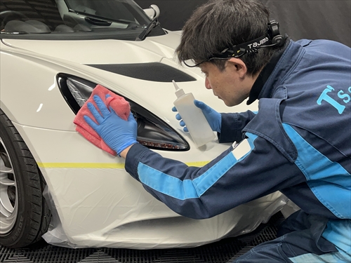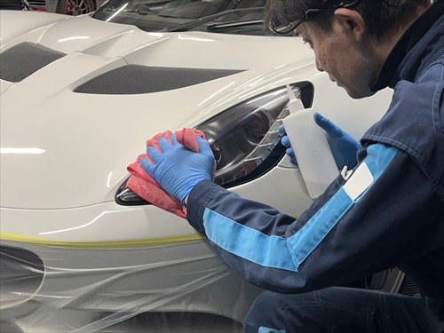 特殊溶剤を使って不純物除去をしたら、プロテクションフィルムを施工して保護していきます。