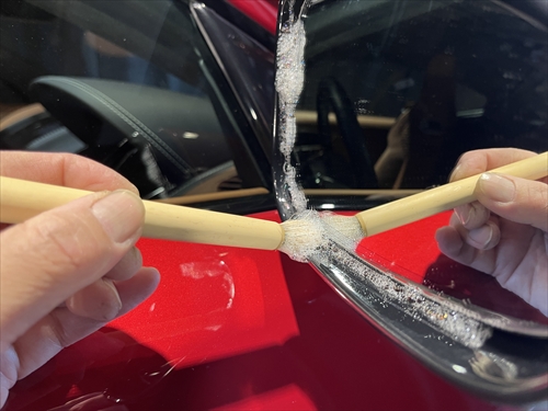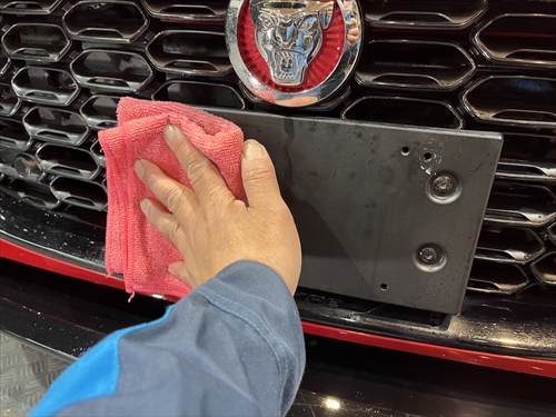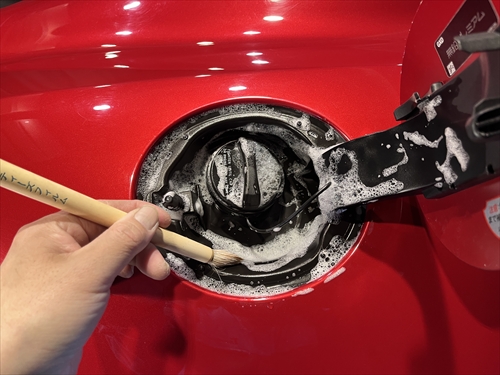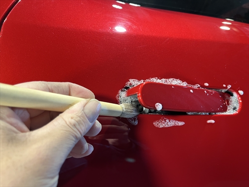 この他にもパーツの継ぎ目やモールの溝、エンブレム周りやグリル部分、給油口の中やナンバープレートの裏側まで、特殊溶剤と熊野筆等を使って細部に至るまでクリーニングしていきます。