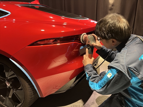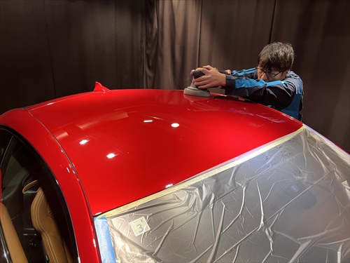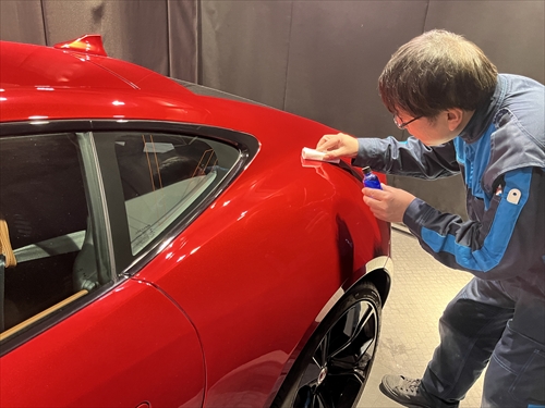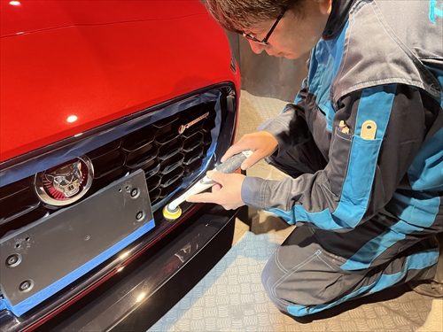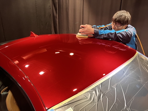 ボディ全体を磨いた後、特殊なベースコンパウンドを使用した研磨処理によって薄い被膜を形成する塗装強化処理を行っていきます。