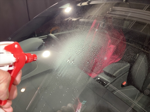 再度フロントガラス全体に水を吹き掛けてみると、磨いた部分がクリアになっていることがわかります。