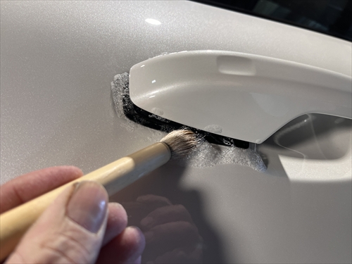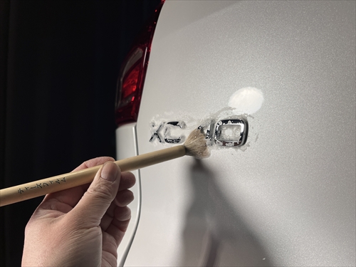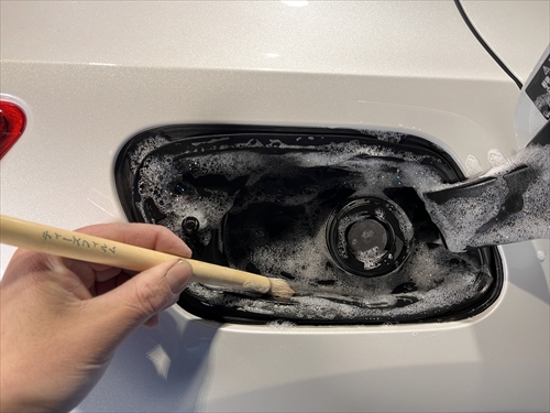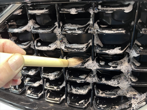 この他にもパーツの継ぎ目やモールの溝、エンブレム周りやグリル部分、給油口の中やナンバープレートの裏側まで、特殊溶剤と熊野筆等を使って細部に至るまでクリーニングしていきます。