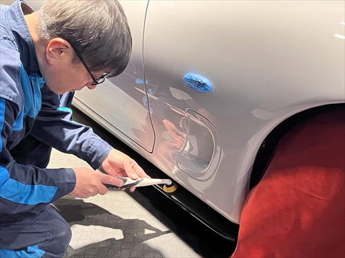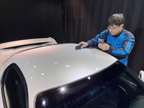まずは特殊照明を配置したコーティングブース内において、塗装膜厚計や光沢計等の計器類を用いながらボディチェックをしていきます。