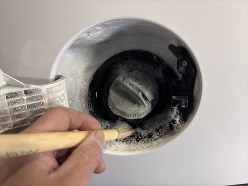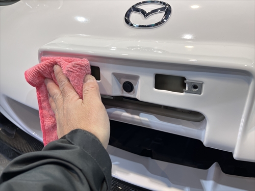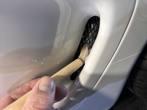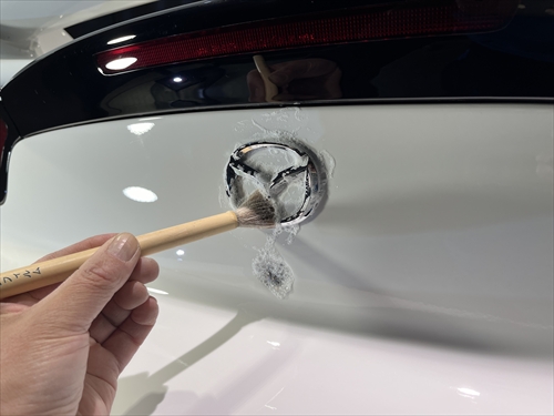 この他にもパーツの継ぎ目やモールの溝、エンブレム周りやグリル部分、給油口の中やナンバープレートの裏側まで、特殊溶剤と熊野筆等を使って細部に至るまでクリーニングしていきます。