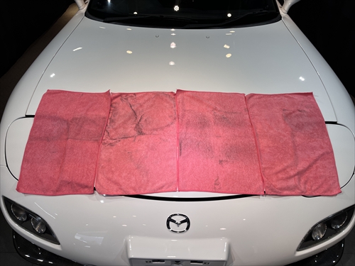 洗車をした後にも関わらず、新品のマイクロファイバータオルがこんなに汚れています。