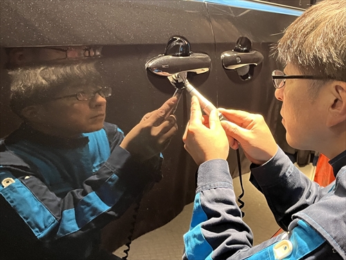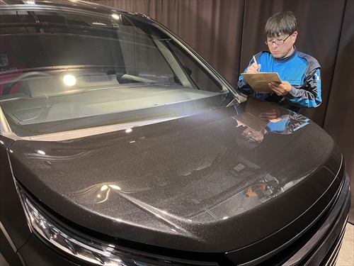 特殊照明を配置したコーティングブース内において、塗装膜厚計や光沢計等の計器類を用いながらボディチェックをしていきます。
