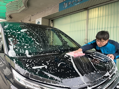 ティーズフィルムでは純水洗車と磨き前の下処理と全く同じ工程を、コーティング施工後のメンテナンスでも取り組んでいます。