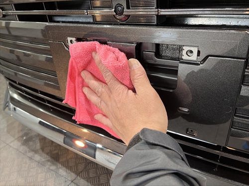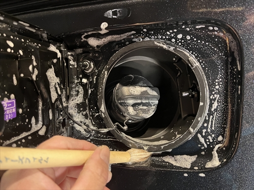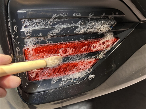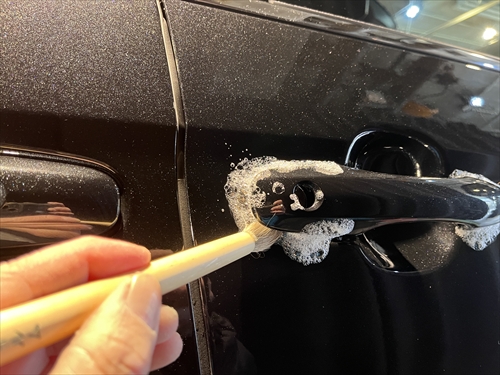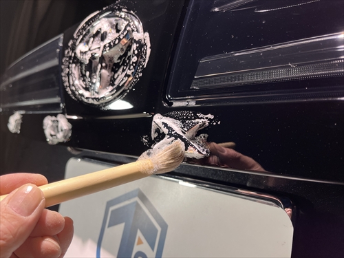 この他にもパーツの継ぎ目やモールの溝、エンブレム周りやグリル部分、給油口の中やナンバープレートの裏側まで、特殊溶剤と熊野筆等を使って細部に至るまでクリーニングしていきます。