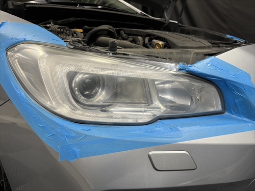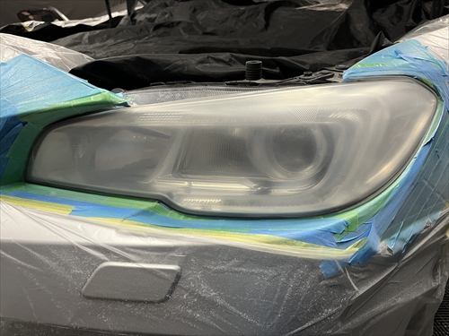 ボディを汚さないように養生したら、まずはヘッドライト研磨(ヘッドライト磨き)で劣化被膜を研磨除去していきます。