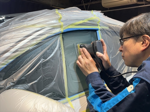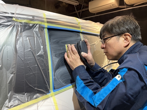 特殊溶剤とサンダーやポリッシャー等の研磨機材を使用してガラスを磨いていきます。