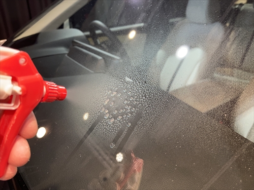 ガラス全体に水を吹き掛けてみると、やはり不純物だらけの状態です。