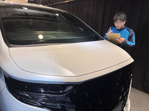 特殊照明を配置したコーティングブース内において、塗装膜厚計や光沢計等の計器類を用いながらボディチェックをしていきます。
