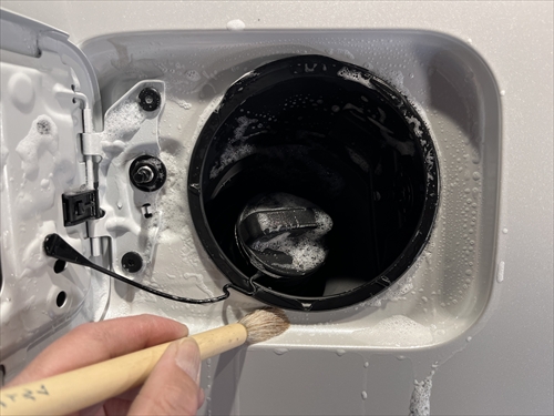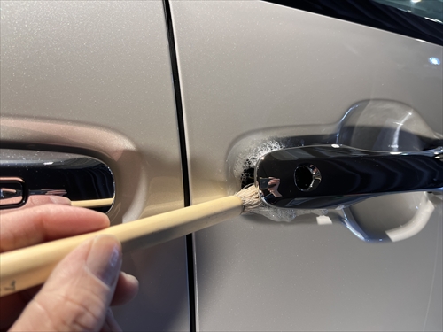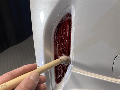 この他にもパーツの継ぎ目やモールの溝、エンブレム周りやグリル部分、給油口の中やナンバープレートの裏側まで、特殊溶剤と熊野筆等を使って細部に至るまでクリーニングしていきます。