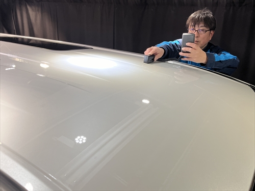 新車の塗装に極力負担を掛けない、いつものボディ磨きでツヤ・光沢を引き出していきます。